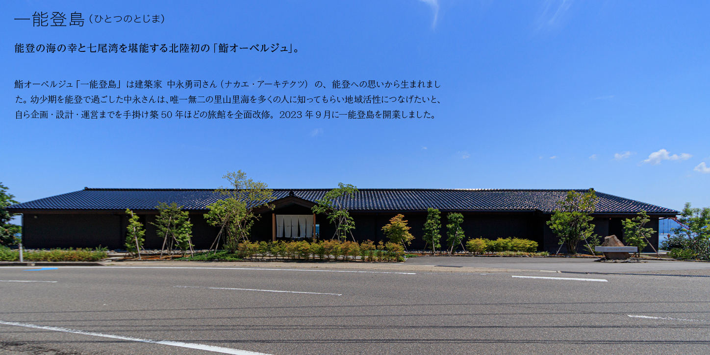 鮨オーベルジュ「一能登島」は建築家中永勇司さん(ナカエ・アーキテクツ)の、能登への思いから生まれました。幼少期を能登で過ごした中永さんは、唯一無二の里山里海を多くの人に知ってもらい地域活性につなげたいと、自ら企画・設計・運営までを手掛け築 50年ほどの旅館を全面改修。2023年 9月に一能登島を開業しました。貸し切りの薪サウナとスパの外には、七尾湾が広がります。