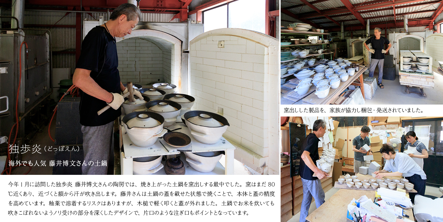 今年1月に訪問した独歩炎藤井博文さんの陶房では、焼き上がった土鍋を窯出しする最中でした。窯はまだ80℃近くあり、近づくと額から汗が吹き出します。藤井さんは土鍋の蓋を載せた状態で焼くことで、本体と蓋の精度を高めています。釉薬で溶着するリスクはありますが、木槌で軽く叩くと蓋が外れました。土鍋でお米を炊いても吹きこぼれないようノリ受けの部分を深くしたデザインで、片口のような注ぎ口もポイントとなっています。