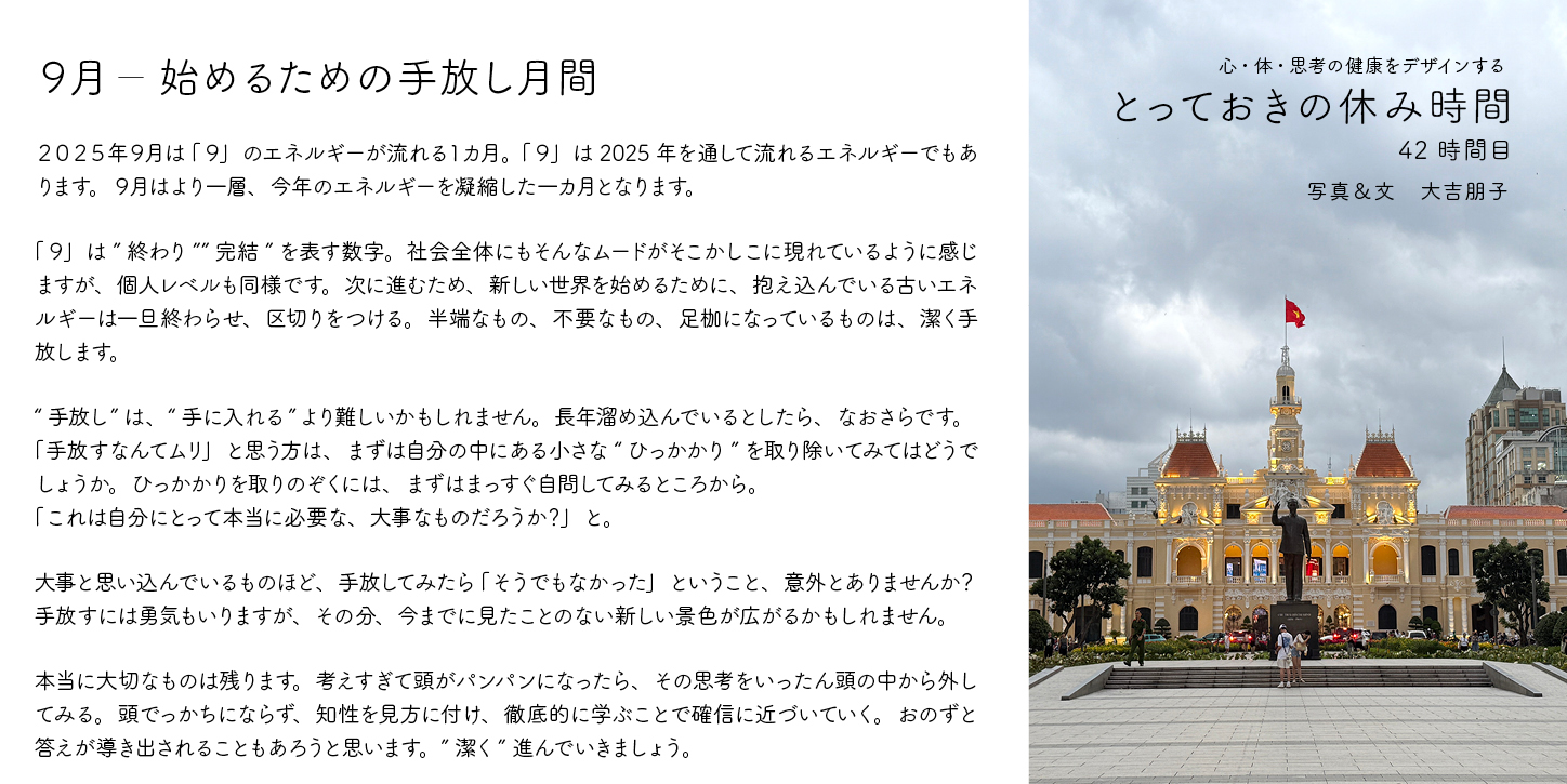 大事と思い込んでいるものほど、手放してみたら「そうでもなかった」ということ、意外とありませんか?手放すには勇気もいりますが、その分、今までに見たことのない新しい景色が広がるかもしれません。