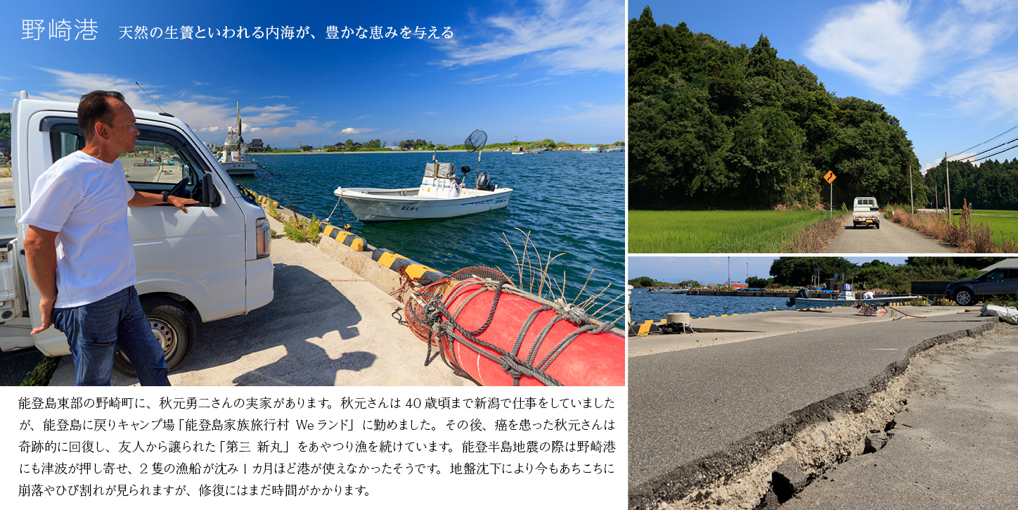 能登島東部の野崎町に、秋元勇二さんの実家があります。秋元さんは 40歳頃まで新潟で仕事をしていましたが、能登島に戻りキャンプ場「能登島家族旅行村Weランド」に勤めました。その後、癌を患った秋元さんは奇跡的に回復し、友人から譲られた「第三新丸」をあやつり漁を続けています。能登半島地震の際は野崎港にも津波が押し寄せ、2隻の漁船が沈み1カ月ほど港が使えなかったそうです。地盤沈下により今もあちこちに崩落やひび割れが見られますが、修復にはまだ時間がかかります。