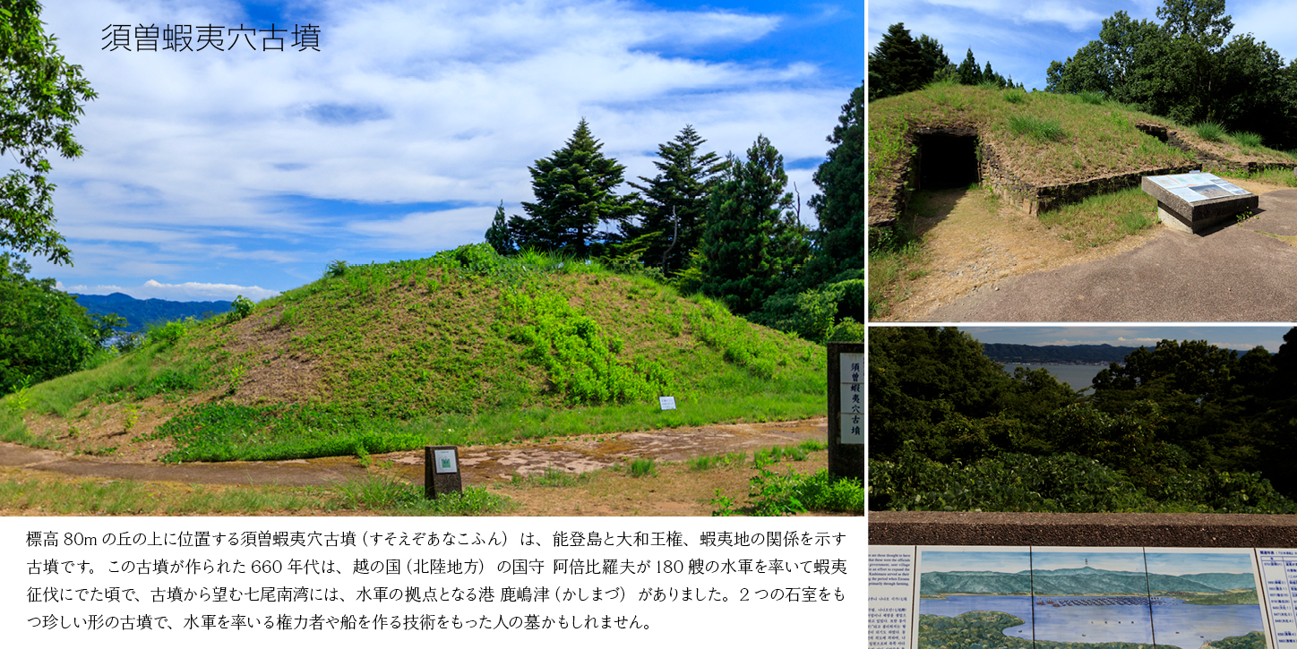 四方に張ったハイヅナが切れると、火焔を上げる柱松明が倒れます。男衆は綱に駆け寄り支柱の丸太を引っ張り出し(来年も再利用するため)、柱が倒れた方向によって豊漁か豊作かを占います。伝説によると、伊夜彦は伊夜比.との逢瀬を楽しんだあと海へ舟を出し、火柱が見えなった場所を永住の地としました。そこが弥彦神社となったそうです。標高 80mの丘の上に位置する須曽蝦夷穴古墳(すそえぞあなこふん)は、能登島と大和王権、蝦夷地の関係を示す古墳です。この古墳が作られた 660年代は、越の国(北陸地方)の国守阿倍比羅夫が 180艘の水軍を率いて蝦夷征伐にでた頃で、古墳から望む七尾南湾には、水軍の拠点となる港 鹿嶋津(かしまづ)がありました。2つの石室をもつ珍しい形の古墳で、水軍を率いる権力者や船を作る技術をもった人の墓かもしれません。