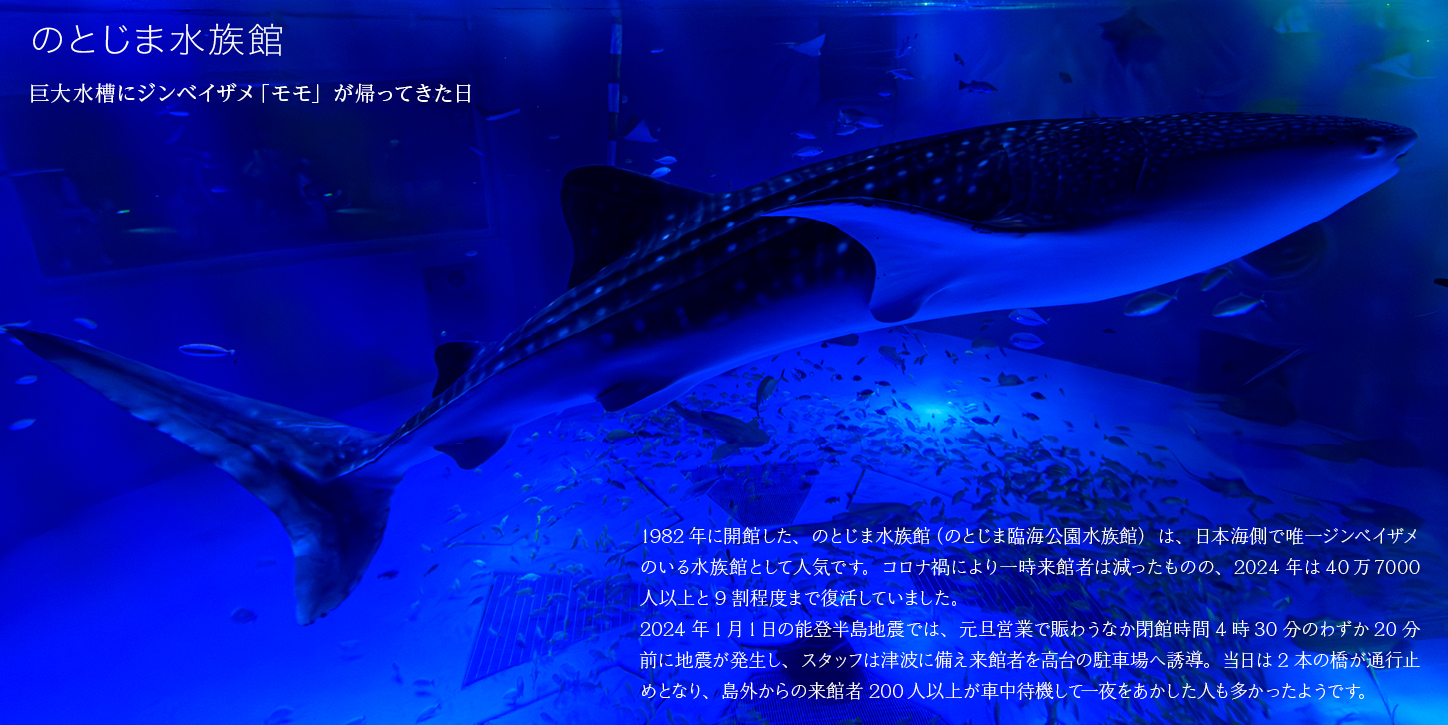 「クラゲの光アート」では、神秘的なクラゲの姿が暗闇に浮かび上がります。震災時はクラゲ水槽の天井が落ちるなどの被害がありました。修復作業はスタッフ総出で、配管の漏水を見つけることからスタートしました。地面にスコップで穴を掘って地下の配管を確認したため、至るところ穴だらけになったそうです。2024年 3月になると、生き物を予備プールに移動して水槽の補修や洗浄、塗装を行い、ガラスを磨いて綺麗にしました。職人の不足からスタッフ自らが作業を行うことも多く、実際に水を送ると新たな漏水が見つかることもありました。6月には各水槽の修復が終わり、2024年 7月 20日から営業を再開します。ジンベイザメ2匹が暮らす巨大水槽の被害は甚大で、水深は半分以下となり、白く濁って中が見えなくなりました。ついに1月 9日には雄のハチベエ、10日には雌のハクの死亡が確認され、冥福を祈るメッセージと共にクラウドファンディングによって 3千万円を超える寄付が集まります。2024年 10月には志賀町沖の定置網にジンベイザメの雌 1頭がかかり、その日の内に水族館に移送されました。「モモ」と名付けられたジンベイザメは、タカサゴ、ノコギリダイ、クロハギ、ツバメウオ、トビエイ、ホシザメ、コロダイなど沢山の魚と共にゆうゆうと水槽を泳ぎまわり、能登島復興のシンボルとなりました。