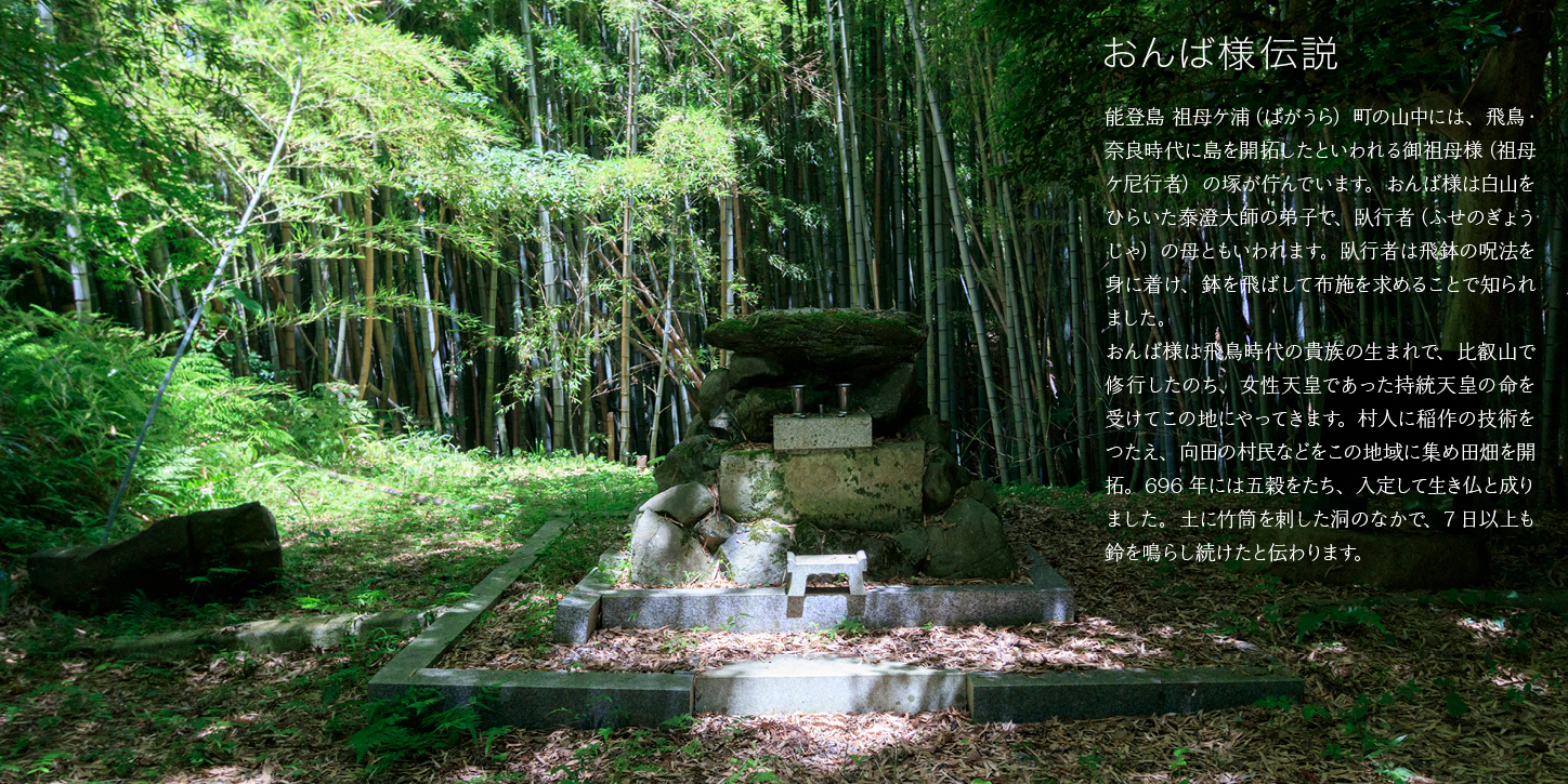 能登島 祖母ケ浦(ばがうら)町の山中には、飛鳥・奈良時代に島を開拓したといわれる御祖母様(祖母ケ尼行者)の塚が佇んでいます。おんば様は白山をひらいた泰澄大師の弟子で、臥行者(ふせのぎょうじゃ)の母ともいわれます。臥行者は飛鉢の呪法を身に着け、鉢を飛ばして布施を求めることで知られました。おんば様は飛鳥時代の貴族の生まれで、比叡山で修行したのち、女性天皇であった持統天皇の命を受けてこの地にやってきます。村人に稲作の技術をつたえ、向田の村民などをこの地域に集め田畑を開拓。696年には五穀をたち、入定して生き仏と成りました。土に竹筒を刺した洞のなかで、7日以上も鈴を鳴らし続けたと伝わります。