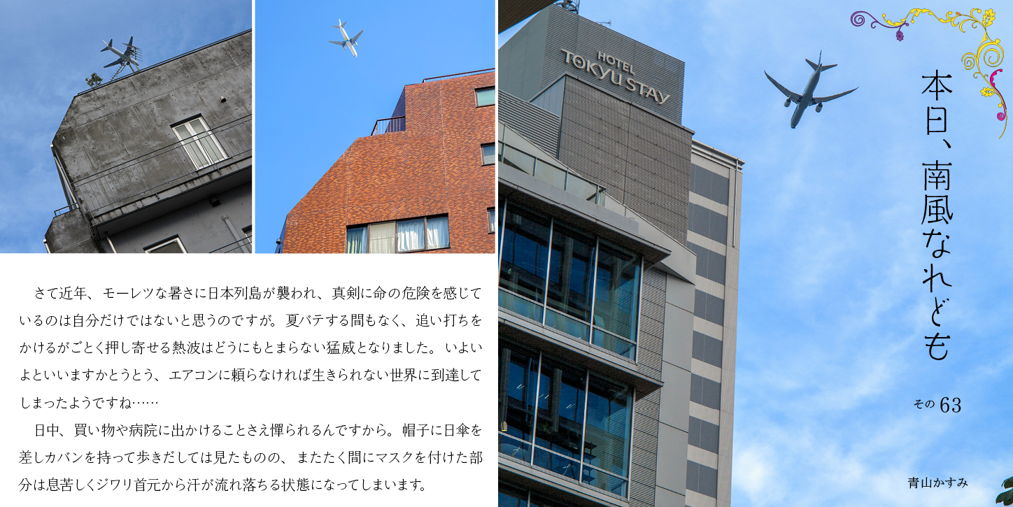 私はせっかくの南風が吹く夏の日を疎ましく想うようになりました。今日もまた表参道交差点に立つ「和をのぞむ -山の手空襲追悼碑」の上を旅客機が轟音を撒き散らし飛んでゆく。