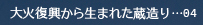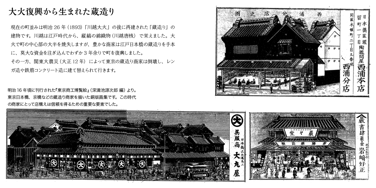 蔵は息をしている -川越 . 時空を超える美意識 https://collaj.jp/朔旦冬至 2025 小江戸川越 川越のシンボルとなった「時の鐘」。江戸情緒を感じさせる蔵造りの町には、年間約 700万人が訪れます。小江戸と言われる「蔵造り」の町並み。なかでも一番街の原家(陶舗やまわ)、宮岡家(まちかん)、小谷野家(フカゼン)が並ぶ一角が、蔵造りの迫力を伝えます。各家屋を道路に対して4度ほど角度をつけて建てることで、屋根のボリューム感を際立たせています。 大火復興から生まれた蔵造り 現在の町並みは明治 26年(1893)「川越大火」の後に再建された「蔵造り」の建物です。川越は江戸時代から、縦縞の綿織物(川越唐桟)で栄えました。大火で町の中心部の大半を焼失しますが、豊かな商家は江戸日本橋の蔵造りを手本に、莫大な資金を注ぎ込んでわずか 3年余りで町を復興しました。その一方、関東大震災(大正 12年)によって東京の蔵造り商家は倒壊し、レンガ造や鉄筋コンクリート造に建て替えられて行きます。 明治16年頃に刊行された『東京商工博覧絵』(深満池源次郎 編)より。東京日本橋、京橋などの蔵造り商家を描いた銅版画集です。この時代の商家にとって店構えは信頼を得るための重要な要素でした。 影盛 富の象徴 影盛と箱棟 「影盛(かげもり)」や「箱棟(はこむね)」が屋根の迫力を引き立ます。影盛は 箱棟鬼瓦をより大きく見せるため漆喰を盛り上げた部分で、大きなものは1m近くありました。箱棟は屋根の棟の上に、箱状の飾り棟を載せたもので、雁振瓦や印籠瓦で装飾されています。 星の船に乗って流れ星をつかまえに行くよ Vol.78 原作:タカハシヨウイチ はら すみれ絵 : タカハシヨウイチ 大沢家明治の大火を生き延び、蔵造りの町のルーツとなった 大沢家は、もともと呉服太物(木綿)を扱う、西村半右衛門(近江屋)によって寛政 4年(1792)に建てられました。半右衛門は天保の飢饉で疲弊する町民に仕事を与えるため、壁厚 20cm以上もある立派な蔵造りを建てます。これが功を奏し明治 26年の大火では火元の近くであるにも関わらず焼け残り、そのことが大火後に蔵造りの商家が増えた理由ともいわれます。大火の際は水槽にむしろをつけて火の粉を防いだり、味噌蔵の味噌を土戸の隙間に塗りつけたと当時 17歳の女性は証言しています。建物のスタイルは、日本橋の釘屋佐藤四郎兵衛家に似たつくりです。昭和 46年(1971)には国の重要文化財に指定され、蔵造りの価値を地元に示すこととなりました。 『東京商工博覧絵』(深満池源次郎 編)より りそなコエドテラスに隣接する小林家は、呉服・太物商を営む2代小林佐平により明治大火の直後に建てられました。外観は切妻の平入りで出桁による二重軒蛇腹、黒漆喰壁に重厚な観音開扉と典型的な蔵造り商家の様式を残し、鬼瓦にカラスと呼ばれる独特の装飾を付けています。これは東京の商家にも見られますが、用途は不明です。1階は土間で、箱階段で上がった2階は使用人の部屋や倉 庫に使われたそうです。 山崎家 亀屋 天明3年(1783)に創業した山崎家の菓子舗「亀屋」は、一番街の入口にあたる仲町の交差点で現在も家業を続け 蔵造り商家のお手本ています。江戸時代には川越藩の御用商人をつとめ、代々嘉七を襲名していました。4代目は第八十五国立銀行の設立に尽力し、5代目は山崎家別邸を建て皇族や華族をもてなすなど、街の経済・文化面に貢献しています。 川越の蔵造り : 川越市指定文化財調査報告書から転載 亀屋は「店蔵」の北側に「袖蔵」と呼ばれる細長い蔵を設けました。袖蔵には、北からの火の手を防ぐ効果もあると言われます。店蔵の間口は4間で、1階店舗の開口部は、木の揚戸(あげど)になっています。その外側に格子戸があり、火災の際はさらに土戸(土を厚く塗った防火性の高い板戸)をはめ込み、隙間に味噌や土を塗り込めて蔵を密閉し、中に火が入ることを防ぎました。2重の軒蛇腹をもつ屋根は、箱棟や影盛、鬼瓦がのった出桁づくり。精度の高い2階の観音開き扉は、開けた扉が隣の扉と噛み合いひとつに見せています。深い庇を 4本の「はね木」で支え、瓦の上には「目塗台」を載せました。これは火災の際、2階の扉を閉め、土で塗り込める目塗のために登る台で、目塗は蔵を建てた大工の仕事です。2階には畳敷きの座敷になっていました。山崎家の敷地には店蔵、袖蔵、土蔵、屋敷、菓子工場などがぎっしりと並んでおり、その多くは川越大火後に5代目山崎嘉七により再建されました。大工は関谷家、左官は亀田家がつとめています。5代目は建築家 保岡勝也の作品で知られる山崎家別邸(前号で紹介)を建てた人です。その先代4代目嘉七は、日本画家橋本雅邦の支援者であり、また川越商工界のリーダーとして活躍しました。雅邦の父親は川越藩の御用絵師で、その縁から川越の有志が「画宝会」を結成。4代目嘉七が幹事をつとめ沢山の雅峰作品を蒐集しています。昭和 57年には、6代目山崎嘉七が古い建物の一部を利用し、雅峰のコレクショ